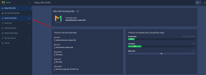 Khi đã đăng nhập vào trong trang quản lý OneMail của quý khách, xong chọn Menu Quản lý tài khoản, ở menu này Quản trị viên có thể tạo thêm mới tài khoản: nhập đầy đủ các thông tin tài khoản,