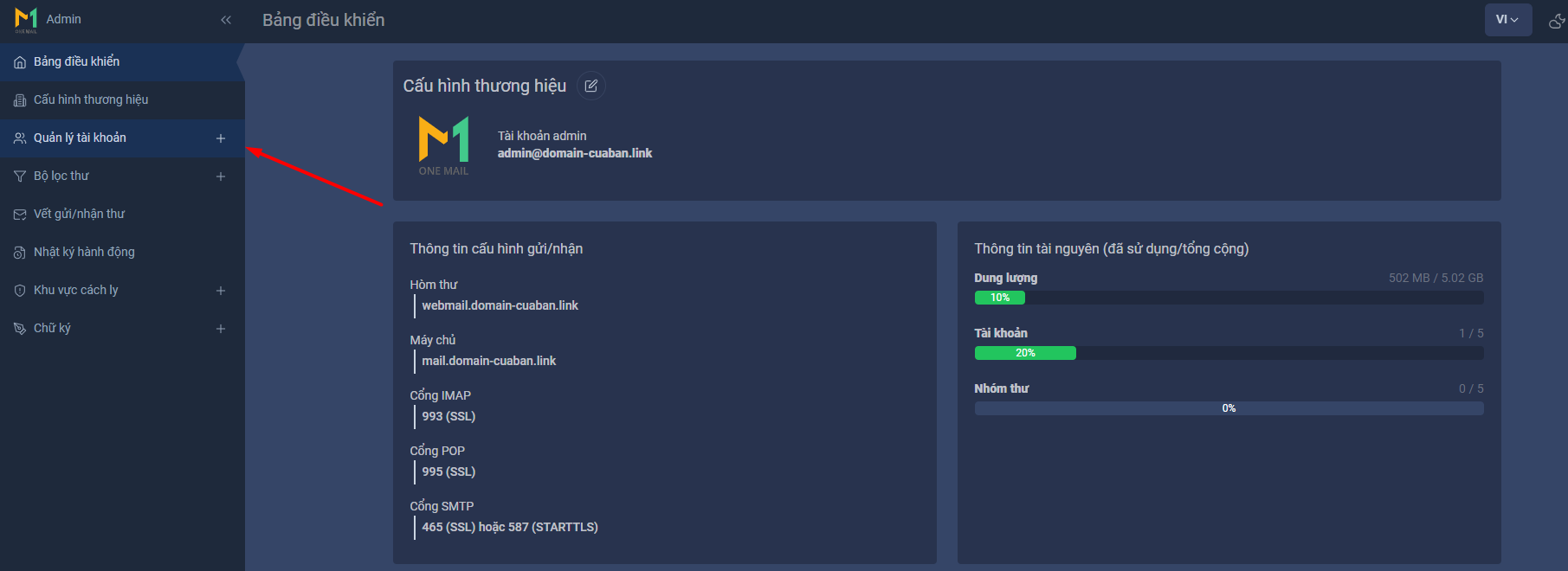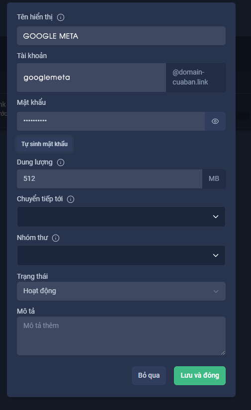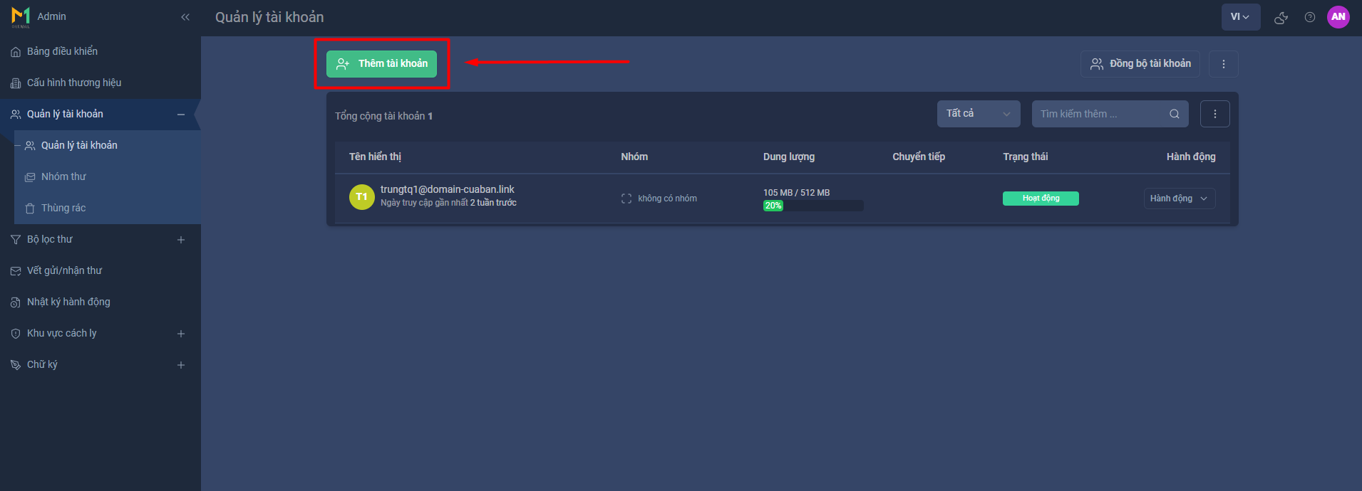 Khi đã đăng nhập vào trong trang quản lý OneMail của quý khách, xong chọn Menu Quản lý tài khoản, ở menu này Quản trị viên có thể tạo thêm mới tài khoản: nhập đầy đủ các thông tin tài khoản, mật khẩu, dung lượng được cấp … Ngoài ra có thể nhập thêm trường Mô tả để mô tả thêm về tài khoản được tạo: