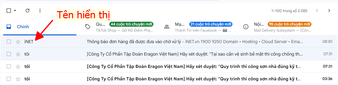 Ghi chú: Tên hiển thị sẽ là tên để khách hàng nhận biết được ai là người gửi emai tới cho mình (Ví dụ ảnh đính kèm)